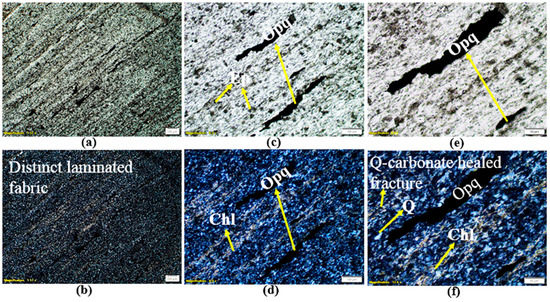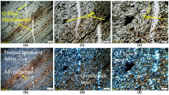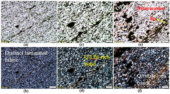 Results of petrographic analysis for microschist sample at 600 °C (S2); images (a–f) were taken at different magnifications (a,b: 1.57×; c,d: 6.3×; e,f: 12.6×). Images (a,c,e) were taken using PPL, while images (b,d,f) were taken using CPL. Image (b) displays very fine-grained laminated texture with segregated light (quartz–chlorite-rich band) and dark (quartz–rutile/biotite-rich band) layering. Tiny, elongated opaque grains (dark) aligned parallel to the foliation plane. Image (c) (PPL) and (d) (CPL) show that rock predominantly consists of quartz (gray in CPL), together with chlorite, rutile or biotite, minor epidote, and opaque grains (dark). Chlorite (pale greenish) occurs in an extremely fine-grained (microscopic) form, is platy-to-flaky in nature, and chlorite grains show alignment parallel to the foliation plane. Rutile or biotite (Brownish in color) displays a similar mode of occurrence, grain size, and morphology as displayed by chlorite. The epidote is minor, occurs in microcrystalline granular aggregates forming scattered-to-dense disseminations, and locally shows alignment parallel to the foliation plane. Q: quartz; Chl: chlorite; Opq: opaque; Ep: epidote.