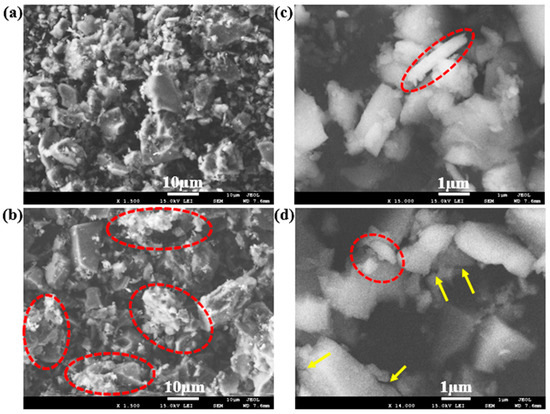 SEM micrographs of the microschist samples: (a) sample at 22 °C (1500×), (b) sample at 800 °C (1500×), (c) sample at 22 °C (14,000×), (d) sample at 800 °C (14,000×).