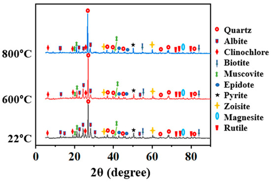 Having identified elements in the studied samples and confirmed some minerals therein using SEM-EDX and petrographic (thin section) analysis, respectively, there is a need to characterize the samples further to identify other suspected minerals as suggested using the thin section method. XRD is a suitable method in this regard. The unheated (22 °C) and heated samples (600 and 800 °C) were characterized to identify the mineral phases and their changes due to high temperatures. The obtained XRD peaks were matched with built-in standard mineral phases XRD-patterns in “PowderX” and “Match!” softwares, and also compared with published work [41,48,50,51]. The findings show that the studied microschist consists of quartz, albite, clinochlore, biotite, muscovite, epidote, pyrite, zoisite, rutile, and magnesite (Figure 12 and Table 2). The unknown types of feldspar, carbonate, and opaque grain suggested using petrographic analysis are confirmed to be albite, magnesite, and pyrite, respectively. The XRD analysis also confirmed that the chlorite observed in photomicrographs of thin sections is chlinochlore, and another phyllosilicate mineral, muscovite, is present in the studied microschist, as indexed in XRD peaks (Figure 12). Furthermore, reddish-brown, very-fine grains, suggested to be rutile or biotite using petrographic analysis, were confirmed to be both rutile and biotite, using the XRD method. Overall, the XRD results agree with those obtained using both SEM-EDX and petrographic analyses. Due to heating, the intensities of quartz increased, while that of albite decreased and nearly disappeared at 800 °C (Figure 12). This can be attributed to the change in quartz (the primary mineral in the studied microschist rock) from the α to β phase at around 573 °C and mineral decomposition after 600 °C [45].