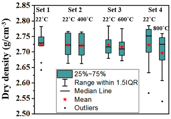 Figure 13 presents the results of dry densities of the studied microschist at different testing temperatures using a set of samples for each temperature. Whether considering the whole samples together (i.e., set 1 to set 4) or individually, set-by-set (i.e., set 1, set 2, set 3 and set 4) tested at room temperature (22 °C), results show that the average dry density of the studied microschist is approximately the same, i.e., 2.723 g/cm3. This reflects a successful strategy of sample selection to be used for the different intended tests. The same is confirmed again where few outliers (only three) can be noticed for the whole forty samples tested at room temperature (Figure 13). Fortunately, only one outlier is within the samples subjected to heating (one of the ten samples named set 4 that are heated to 800 °C). Figure 13 also confirms that dry densities of the studied microschist samples fall within 1.5-times the interquartile range (IQR); which indicates low variability. Both statistics emphasize that the technique of sample categorization used in this study mitigated the effect of anisotropic property of the microschist [40]. Considering set 2, set 3, and set 4 which were tested at room temperature and at high temperatures (Figure 13), it can be observed that no noticeable change in dry density occurs for set 2, meanwhile, dry density changes can be noticed for set 3 and set 4 (Figure 13). At 800 °C (set 4), the dry density of the studied microschist decreased by about 0.97%. This decrease in density after heating can be explained in the light of already-published data, where slight mass loss and a small increase in volume due to change in quartz from α to β at a temperature around 573 °C and thermal mineral decomposition above 600 °C [45]. A similar decrease in density has been reported for granodiorite [45] and granite [44] at the same heating rate, as employed in this study (5 °C/min). The results show that density of granodiorite (600 °C) and granite (800 °C) decreased by 2.46 and 2.80%, respectively [44,45].