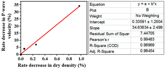 Correlation between rate decrease in dry density and rate decrease in P-wave velocity of the studied microschist at high temperature.