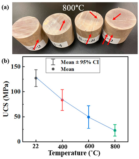 (a) Crack observation for the samples heated at 800 °C, (b) UCS of the studied samples at different temperature.