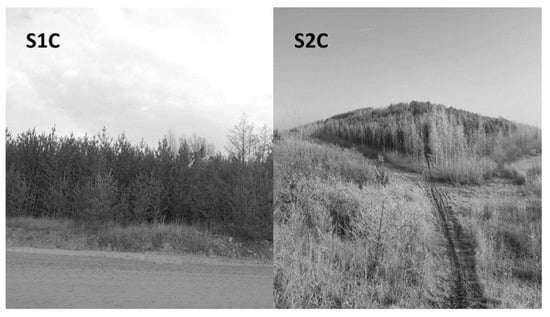 In the current study, two different open-cast post-mining soils recultivated with different methods have been studied: limestone post-mining soil (S1) recultivated with embarkment obtained in the mining process, and lignite post-mining soil (S2) recultivated with sewage sludge obtained in a wastewater treatment plant. The remediation of the studied post-mining soil is directed for reforestation (Figure 1). Both places are located in Poland.