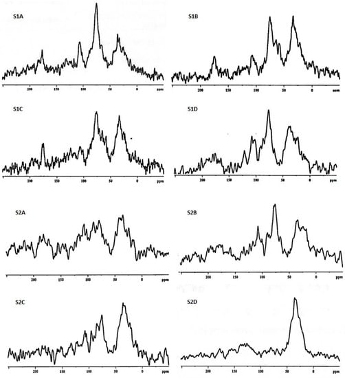 Spectra of 13C CP MAS NMR for studied soils (S1—soil collected from the limestone open-cast mining remediated with embarkment obtained during the mining process; S2—soil collected from the lignite open-cast mining remediated with sewage sludge; subsequent letters (A–D) mean a different remediated area located at the same mine).