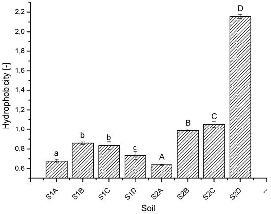 Hydrophobicity for studied soils (S1—soil collected from the limestone open-cast mining remediated with embarkment obtained during the mining process; S2—soil collected from the lignite open-cast mining remediated with sewage sludge; subsequent letters A–D mean a different remediated area located at the same mine). Mean values ± SD, n = 3. Different letters above the columns indicate significant differences between tested treatments (p < 0.05) according to Tukey’s test. Small and large letters indicate a separate analysis for both soils.
