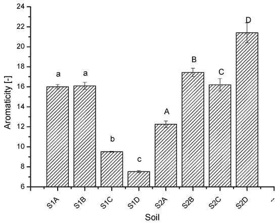 Aromaticity for studied soils (S1—soil collected from the limestone open-cast mining remediated with embarkment obtained during the mining process; S2—soil collected from the lignite open-cast mining remediated with sewage sludge; subsequent letters A–D mean a different remediated area located at the same mine). Mean values ± SD, n = 3. Different letters above the columns indicate significant differences between tested treatments (p < 0.05) according to Tukey’s test. Small and large letters indicate a separate analysis for both soils.