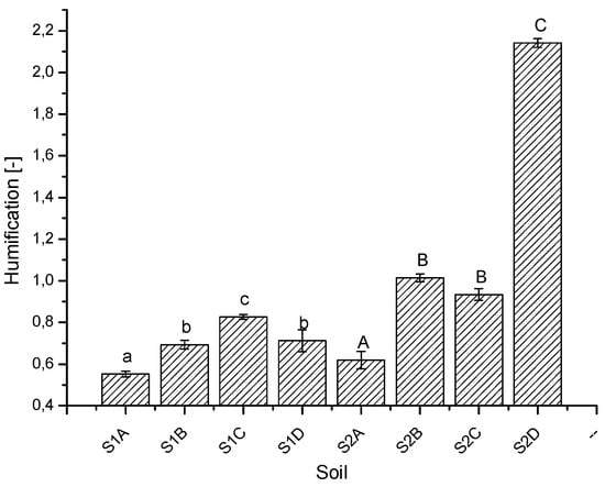 Humification for studied soil (S1—soil collected from the limestone open-cast mining remediated with embarkment obtained during the mining process; S2—soil collected from the lignite open-cast mining remediated with sewage sludge; subsequent letters A–D mean a different remediated area located at the same mine). Mean values ± SD, n = 3. Different letters above the columns indicate significant differences between tested treatments (p < 0.05) according to Tukey’s test. Small and large letters indicate a separate analysis for both soils.