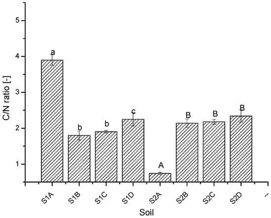 C/N ratio for studied soils (S1—soil collected from the limestone open-cast mining remediated with embarkment obtained during the mining process; S2—soil collected from the lignite open-cast mining remediated with sewage sludge; subsequent letters A–D mean a different remediated area located at the same mine). Mean values ± SD, n = 3. Different letters above the columns indicate significant differences between tested treatments (p < 0.05) according to Tukey’s test. Small and large letters indicate a separate analysis for both soils.