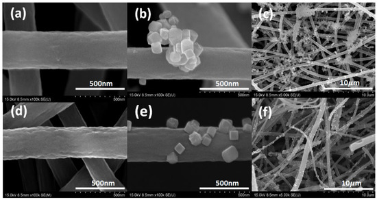 FE−SEM image of (a) CNF (d) CNF−FeN@GnP, high−magnification of (b) Co3O4/CNF (e) Co3O4/CNF−FeN@GnP and low−magnification of (c) Co3O4/CNF (f) Co3O4/CNF−FeN@GnP.