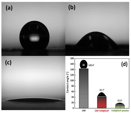 Contact angle image of (a) CNF (b) CNF−FeN@GnP (c) FeN@GnP powder (d) comparison graph of contact angle.