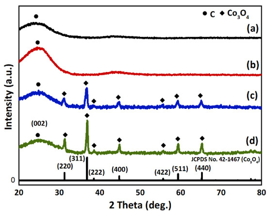 The crystallinity of CNF, CNF/FeN@GnP, Co3O4/CNF, and Co3O4/CNF−FeN@GnP was analyzed by XRD, and the results are shown in Figure 3. The presence of the (002) peak in the 2θ range of 20°–30° in the XRD patterns of Figure 3a,b indicates the existence of amorphous carbon. After hydrothermal synthesis, the intensity of the peak corresponding to amorphous carbon decreased owing to the relatively high crystallinity of Co3O4 loaded on the nanofiber support. The results confirmed that the prepared Co3O4/CNF and Co3O4/CNF−FeN@GnP were well−developed into Co3O4 (JCPDS No. 42−1467) crystalline structures, as shown in Figure 3c,d, corresponding to Co3O4 phases with the (111), (220), (311), (222), (400), (422), (511), and (440) planes. In addition, Co3O4 did not exhibit any additional peak corresponding to any impurity or secondary phase. The presence of a Co3O4 peak in the XRD pattern confirmed that the nanoparticles loaded on the nanofiber support were those of Co3O4, as also corroborated by the SEM−EDX results. These results prove that Co3O4/CNF and Co3O4/CNF−FeN@GnP were successfully prepared after hydrothermal synthesis [24].