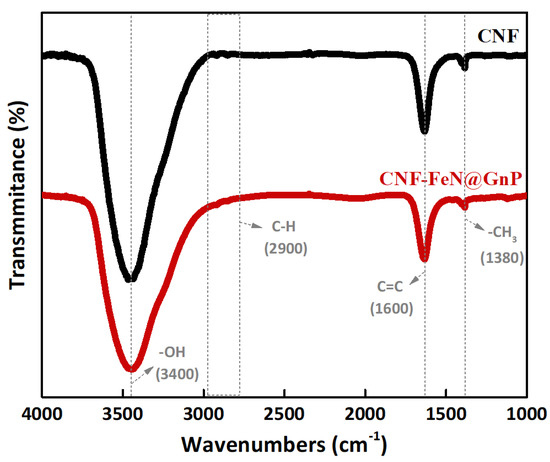 To further identify the hydrophobic/hydrophilic surface properties of CNF and the CNF−FeN@GnP nanofiber supports, the functional groups were determined by FT−IR spectroscopy. Figure 4 shows that CNF and CNF/FeN@GnP possessed functional groups such as −OH (3400 cm−1), C−H (2900 cm−1), C=C (1600 cm−1), and −CH3 (1380 cm−1). The FT−IR peak intensities of CNF and CNF/FeN@GnP were difficult to confirm in the FT−IR spectra because a small amount (0.009 g) of FeN@GnP powder was added to the CNFs. However, the peak intensities of the −CH and −CH3 groups of the CNFs were slightly higher than those of CNF/FeN@GnP. The integral values of the peak(−CH3)/(C=C) for CNFs and CNF/FeN@GnP were 0.044 and 0.042, respectively. Zhu et al. reported that −CH [41] and −CH3 groups [42] in the FT−IR spectra induced hydrophobic properties. Therefore, these results confirmed that the CNF support has hydrophobic properties, making the FT−IR results consistent with the contact angle measurements.