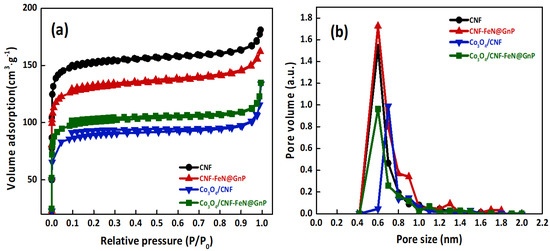 Figure 5 shows the nitrogen adsorption/desorption isotherms of CNF, CNF/FeN@GnP, Co3O4/CNF, and Co3O4/CNF−FeN@GnP. The isotherms were typical type I, indicating the existence of well−developed micropores in the samples, as shown in Figure 5a. The specific surface areas of CNF, CNF/FeN@GnP, Co3O4/CNF, and Co3O4/CNF−FeN@GnP were 598.25, 509.38, 342.98, and 391.88 m2/g, respectively. The specific surface areas of CNF and the CNF/FeN@GnP nanofibers were similar. CNF/FeN@GnP had a slightly lower specific surface area than the CNFs because FeN@GnP was partially embedded in the CNFs and provided a slightly less rough nanofiber surface of FeN@GnP. In addition, the pore volumes of CNF, CNF/FeN@GnP, Co3O4/CNF, and Co3O4/CNF−FeN@GnP were 0.2757, 0.2499, 0.1883, and 0.1966 cm3/g, respectively, as shown in Figure 5b. The smaller pore volume of CNF/FeN@GnP compared to that of the CNFs can additionally confirm the effect of FeN@GnP powder on the specific surface area. In addition, the specific surface area decreased after loading Co3O4 nanoparticles onto CNF and the CNF/FeN@GnP nanofiber supports because the loaded nanoparticles induced a decrease in the pore volume of the nanofiber. These results were confirmed by a decrease in the pore volume intensity, as shown in Figure 5b.