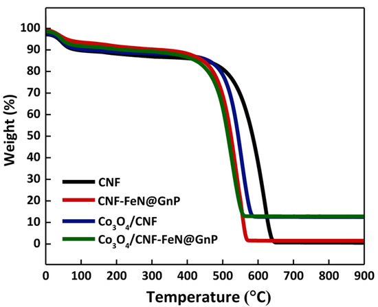 Thermogravimetric analysis (TGA) curves of CNF, CNF−FeN@GnP, Co3O4/CNF, and Co3O4/CNF−FeN@GnP.