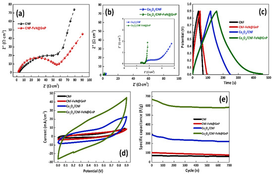 Figure 7a shows typical Nyquist plots of the CNF and CNF−FeN@GnP samples measured under open−circuit conditions. The polarization resistance of CNF/FeN@GnP was evaluated to be approximately 62.9 Ω, which is much lower than that of the CNFs (73.9 Ω). A lower polarization resistance leads to improved conductivity [44] and faster charge transport owing to the redox properties of FeN@GnP. Figure 7b shows the Nyquist plots of Co3O4/CNF (1.49 Ω) and Co3O4/CNF−FeN@GnP (0.2 Ω). Co3O4 loading on each nanofiber support resulted in a lower polarization resistance compared to those of other nanofiber supports. Co3O4 loading increased the electroconductivity through the redox reaction of metal oxides and can improve the performance of the supercapacitor [45]. At the lower frequency, the linear line was related to the Warburg diffusion resistance. Most of the samples had a vertical line tilt at an angle of 45 degree, and Co3O4/CNF−FeN@GnP samples with a slope close to vertical showed that the ions diffused rapidly [46]. In the GCD curve (Figure 7c), Co3O4/CNF−FeN@GnP showed an excellent specific capacitance of 668 F/g compared to those of the other samples (CNF, CNF−FeN@GnP, Co3O4/CNF had capacitances of 71, 102, and 291.1 F/g, respectively). The Co3O4/CNF and Co3O4/CNF−FeN@GnP nanofibers showed different results despite being loaded with Co3O4. This was because the nanoparticles were more evenly dispersed and grown on the surface of the Co3O4/CNF−FeN@GnP nanofibers due to the hydrophilic properties of the CNF/FeN@GnP nanofiber support. The loading amount of Co3O4 particles was confirmed to be similar in TGA, but it was obvious that the dispersion and agglomeration of Co3O4 particles affected the difference in the performance. The GCD curve of CNF, CNF−FeN@GnP, Co3O4/CNF, and Co3O4/CNF−FeN@GnP electrode measured in the potential range of 0 to 0.9 V at various current densities is shown in Supplementary Material Figure S2a–d. It can be seen that the specific capacitance of the electrode was decreased with an increase in current density. At low current density, the specific capacitance was high, which might be due to a slow Faradic, as well as non−Faradic reaction. At a high current density, the diffusion of ions occurred mainly implying a fast electrochemical reaction.