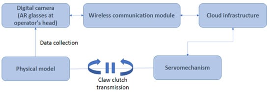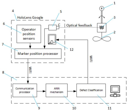 Figure 1 shows a schematic diagram of a measurement system. The user equipped with AR goggles observes a designated object. Information acquired during the mapping process is transmitted via a wireless communication module to the external processing infrastructure. Ultimately, neural network-based data analysis might be calculated by the integrated CPU directly. However, during preliminary research, it was decided to conduct data post-processing using a cloud infrastructure. The neural network algorithm was located in the exact location as the software responsible for controlling the rotary force generator. In this case, an electrical servomechanism can accurately control the rotational speed of the wind turbine model. Image processing and analysis, marker oscillation detection, and classifying detected defects were conducted in the cloud that sends feedback information wirelessly to the AR goggles to display data concerning an object in real-time.