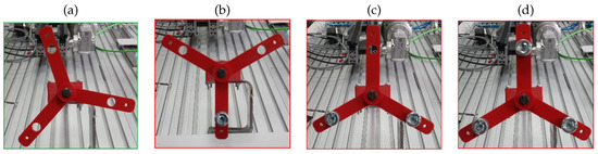 - State 4 (Figure 5d)—balanced propeller with the additional mass on all three of the propeller’s blades. This state is supposed to simulate the overloading mechanical components of a wind turbine.