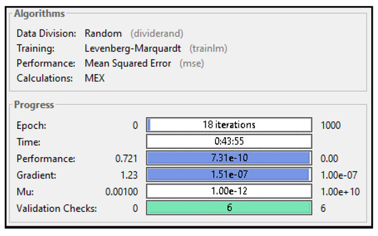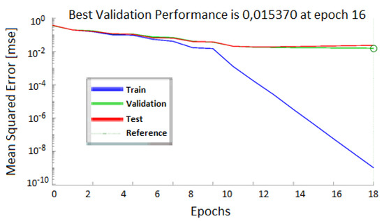 The neural network performance was assessed using a mean squared error method, and output calculations were made with the MEX algorithm [42]. The training continued until the 18th iteration, where the validation error stopped decreasing.