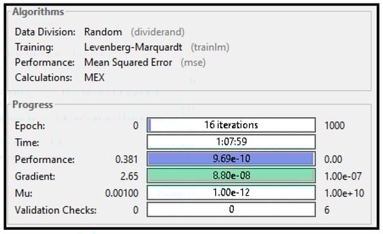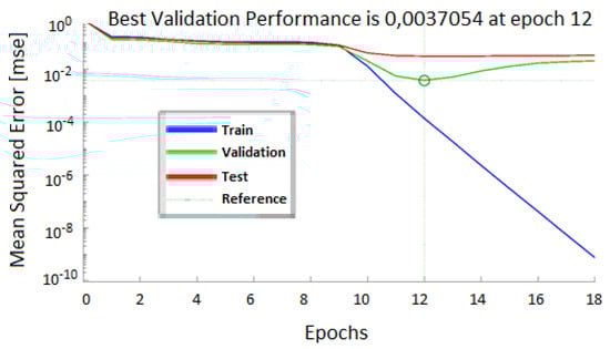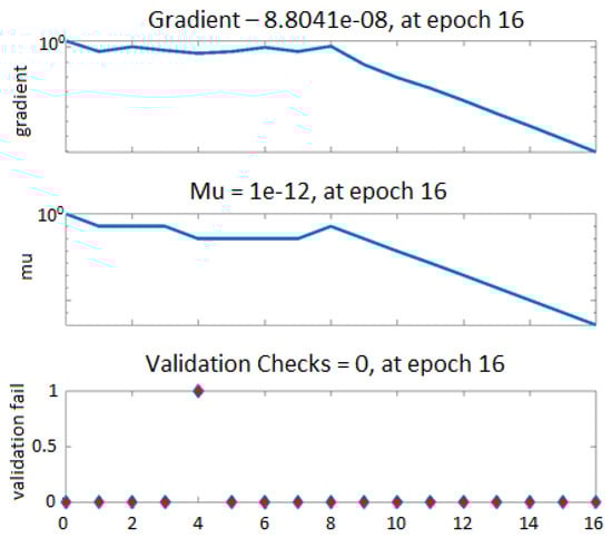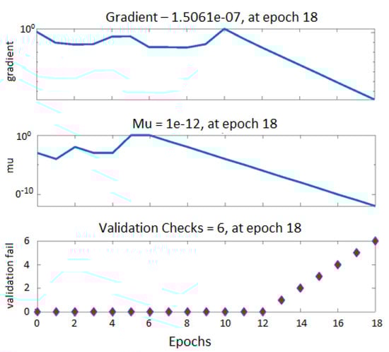 Figure 13 shows a graphic representation of the learning process during 18 epochs as a relation between several epochs’ gradients, , and validation failure. The gradient represents a numerical calculation used for adjusting neural network parameters, is the control parameter used in the Levenberg–Marquardt algorithm, and ”val fail” (validation failure) represents a condition where training stops after neural network performance degrades for six consecutive epochs. Performance degradation indicates that data sets used might be difficult to process for the training algorithm. Thus, validation check errors could occur.