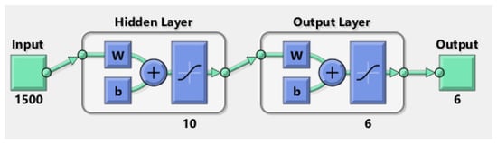 The deep learning algorithm was based on the NET1_HF neural network, consisting of 1 hidden layer with 10 neurons and 1 output layer with 2 neurons, where 1500 one-second samples were used as input data, as shown in Figure 10. Both the frequency and the amplitude of oscillations in the model were analyzed in order to classify the sample as either a malfunctioning or a well-maintained wind turbine.
