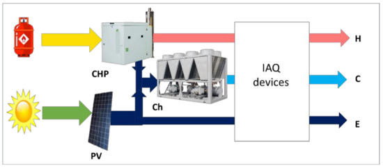 The polygeneration system has been designed with the main idea of avoiding, as much as possible, the consumption of fossil fuels and therefore using local renewable energies instead. For that, combined heat and power devices (CHP) and photovoltaic panels (PV) are connected to a chiller to provide heating (H), cooling (C) and electricity (E), in order to achieve the required thermal comfort and indoor air quality in combination with the ventilation system see (Figure 3).
