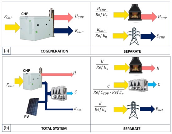 There are currently specific indicators for polygeneration systems that aim to show the improvements of this system with respect to the separate generation. The energy saving is simply the decrease in consumption compared with the separate reference generation. Therefore, cogeneration energy savings ( E S C H P ) and total energy savings ( E S T O T ) are defined as follows [16], as can be seen in Figure 4: