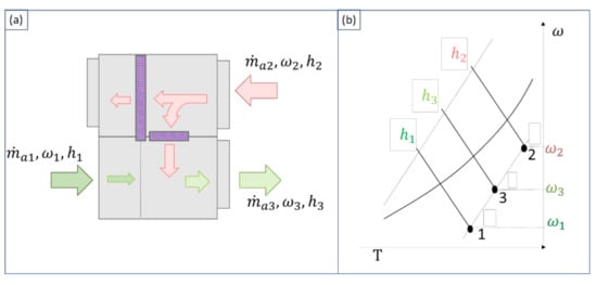 Figure 6. (a) Adiabatic mixture and (b) psychometric diagram of the process.
