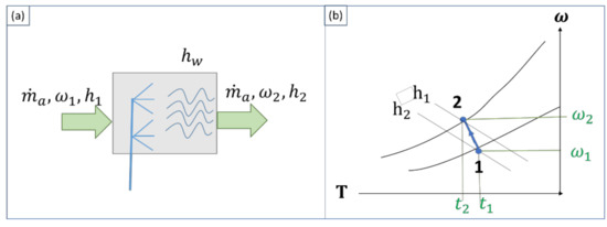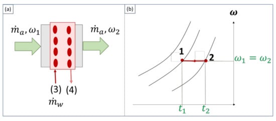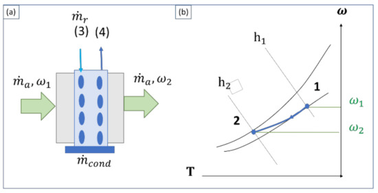Figure 8. (a) Dehumidification by cooling and (b) psychometric diagram of the process.