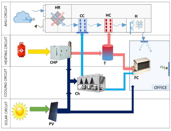 The polygeneration facility is designed based on the office-building requirements. Accordingly, the correct ventilation system, the air-handling unit (AHU), the generation units and the corresponding auxiliary devices and renewable technologies would provide the appropriate indoor thermal comfort conditions, as well as indoor air quality.