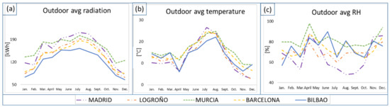 Figure 1 describes the geographic locations of the office buildings in Spain (Figure 1): Madrid, Logroño, Murcia, Barcelona and Bilbao; each location corresponds to a specific Iberian Peninsula climate in terms of the maximum/minimum temperatures and relative humidity, and the average values are presented in Table 1.