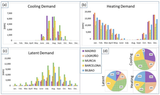 Figure 13. Monthly (a) cooling, (b) heating and (c) latent demand of the office and (d) relative demands in the 5 cities.