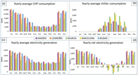 Figure 14. Yearly (a,b) energy consumption and (c,d) electricity generation in the 5 cities.