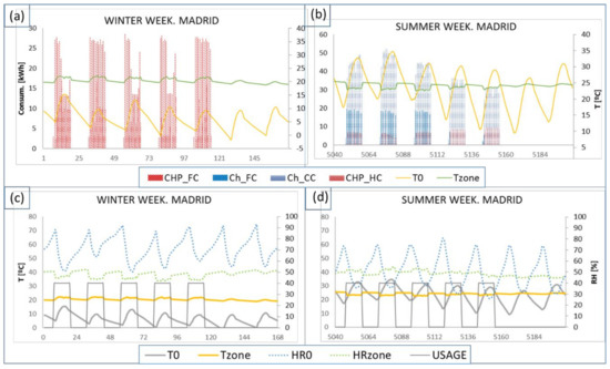 Figure 15. Indoor conditions of a representative (a,c) winter week (1st of January) and (b,d) summer week (1st of August) in Madrid.
