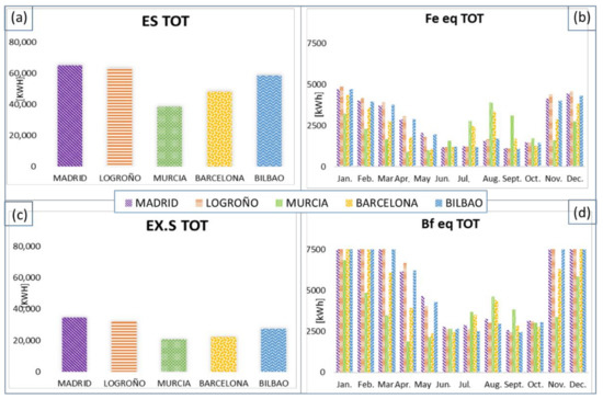 Figure 16. Yearly (a,c) total energy/exergy savings and (b,d) monthly total equivalent electric fuel/exergy consumption.