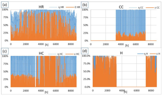 Figure 17. Energy and exergy efficiency of AHU components in Madrid (a) HR (b) CC (c) HC (d) H.