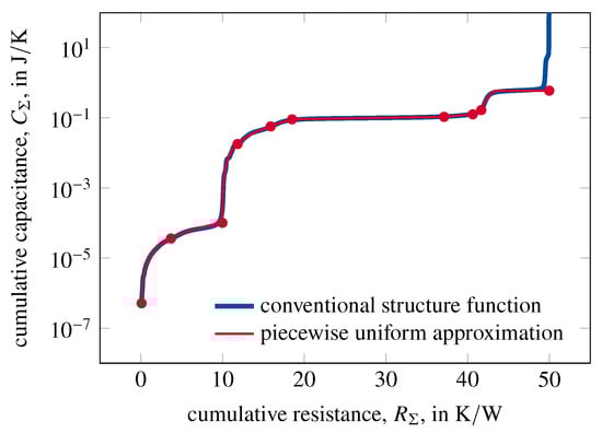 The initial intermediate thermal network, i.e., the starting values for the optimization during the network simplification, are given by points, , evenly spaced along the arc length of the forward structure function. In addition, truncating the divergence at high , which is a numerical artifact of the Foster-to-Cauer transformation, increases the accuracy and the stability of the convergence. For a good convergence, it should be ensured that the total thermal resistance of the initial intermediate thermal network is identical to the total thermal resistance of the measured thermal impedance.