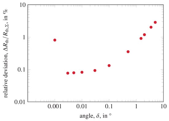 In the following, an analysis is performed to determine appropriate parameters for inverse calculations. The accuracy is mainly determined by the angle and the sampling parameters. The computational workload depends significantly on the number of points used for . To strike a balance between computation time and accuracy, points in the range are used. To determine an optimum value of for this sampling rate, a test series is performed. Figure 2 shows the relative deviation, for different values of and fixed sampling frequency. As a test case, structure 1 (see Table 1) is used. At high angles, the accuracy is relatively low due to the error made in Equation (3). At very low angles of , the peaks are too narrow to be captured correctly, given the sampling frequency. A value of limits the error made in Equation (3) while making sure that all peaks are captured correctly. For smaller angles and higher sampling frequencies, the error is also limited by the width of the chosen interval.