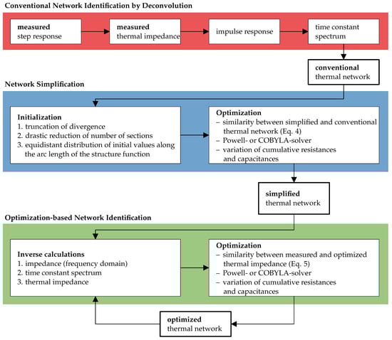 The scheme of Figure 3 visualizes the procedure of optimization-based network identification. Starting from the measured step response (top left), a conventional network identification by deconvolution is performed first. Then, a network simplification is performed (see Figure 1). In this step, the thermal structure function resulting from network identification by deconvolution is approximated by a piecewise uniform structure function, truncating the divergence at the end. A multi-dimensional optimization is performed, which optimizes the resistance and capacitance of each section. The goal is to minimize the discrepancy between the conventional thermal network and the simplified thermal network with a given number of sections. As a last step, an optimization-based network identification is performed. In this step, the simplified thermal network is optimized to best match the measured thermal impedance. The result is the optimized thermal network. For each function evaluation during the optimization, an inverse calculation is performed. Once the optimized thermal network is in good agreement with the measured thermal impedance, the optimization is successful.