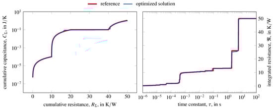 For network simplification as shown exemplarily in Figure 1, the results of the following optimization-based network identification are shown in Figure 4. The value of the objective function resulting from the initial simplified thermal network is . After the main optimization, the value of the objective function is reduced to . For comparison, the value of the objective function for the backwards thermal impedance is . To calculate accurate structure functions, a low value of is an important sanity check and suitable to validate solutions. However, it is not a sufficient measure of accuracy for a solution. A holistic comparison of the accuracy of various methods is performed in the following section.