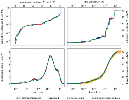 An example of a thermal impedance with a signal-to-noise-ratio of is shown on the bottom right of Figure 5. In addition, the backwards thermal impedance from Bayesian deconvolution and the optimization-based solution are plotted. The other parts of the image show the corresponding evaluations using Bayesian deconvolution and optimization-based network identification. The impulse response and thermal impedance for the Bayesian solution are generated by reconvolving the time constant spectrum. This is done to reveal effect of deconvolution and to shown the impulse response as well as the thermal impedance actually belonging to the time constant spectrum. The exact input data belonging to structure 1 are shown for comparison.