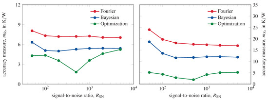 In Table 4, the accuracy values achieved by the Bayesian and the optimized solution are shown in addition to the median accuracy values, which are taken from Figure 6. The noise pattern presented in Figure 5 leads to a solution with a quality significantly below average. Still, the optimization algorithm is able to increase the accuracy of the time constant spectrum and the structure function. The thermal impedance resulting from an optimization-based network identification matches better with the exact thermal impedance of structure 1 than the original Bayesian solution. While the optimization procedure is able to increase the accuracy of a forward solution significantly, it is still based on the initial values. The optimization might converge to a local minimum which does not represent the global optimum.