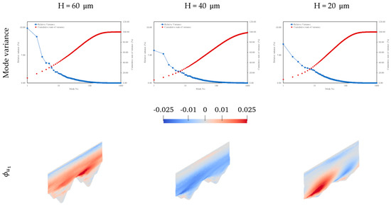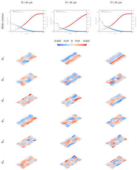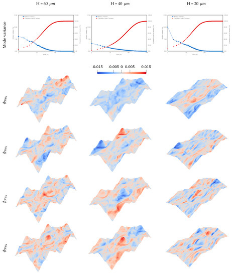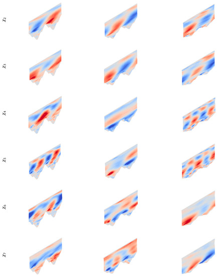 Aside from the mode shapes, the mode variance distributions for the Nu numbers verify the intensification of the thermal role of span-wise mixing with the increase of the roughness height. In fact, with the increase of the roughness height to , the pattern of the Nu mode variance distribution (see Figure 10) becomes very similar to the mode variance distribution pattern of the corresponding height for the flow modes in the horizontal plane, which is dominated by the von Kármán mechanism (see Figure 7). This is attributed to the more dominant role of span-wise mixing caused by von Kármán instability with the increase of height level of high-rise peaks.