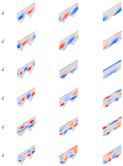 The EPOD modes representing thermally importance-based ranked flow modes are provided in Figure 8. According to the mode shapes corresponding to the high level of roughness, the EPOD modes verify the fact that the active/strong fluctuating structures are mainly introduced by peaks, and the valleys in the case of a high roughness level play a minimal role in thermal transport. The other point inferred from the EPOD modes is the similarity of the mode topologies to the energetic POD modes. This shows the importance of the energetic flow structures in heat transfer in the analyzed 2D stream-wise wall normal planes. The EPOD modes in Figure 8 corresponding to the medium level of roughness show the thermal importance of the large-scale Kelvin–Helmholtz-induced structures followed by small-scale structures distributed in the entire domain including valleys. This verifies the thermal importance of valley-involving flow modes, which is acting against the flow trap effect in these areas. With the reduction of the large-scale flow structures in the case of the low level of roughness, there is a change in the rank of thermally important flow modes compared to the energy-based ranked modes. In fact, the large-scale Kelvin–Helmholtz-induced structures still appear among the first few modes, but above them, the small-scale structures active all over the domain gain thermal importance. In more detail, comparison between Figure 6 and Figure 8 indicates that for the high level of roughness, the same mode topologies appear as the first few energetic POD modes and thermally-important EPOD modes. However, when the same comparison is made for the low level of roughness, it is observed that the first few large-scale POD modes that appear as the most energetic among the TKE-ranked modes come after some small-scale flow structures among the thermally important EPOD modes. This is attributed to the fact that the energetic POD modes corresponding to the Kelvin–Helmholtz mechanism at a low level of roughness lose their thermal importance compared to the high level of roughness. In addition to the mentioned points, the engagement of valleys in the thermally important modes can also be observed in this figure.