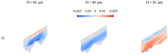 For the modal decomposition analysis, the snapshots of the flow/thermal fields are reported on the horizontal and wall-normal stream-wise planes as illustrated in Figure 5. The horizontal plane in all cases is located at , where is the peak height, and the wall-normal plane is located at the middle of the periodic domain along the X-axis at X = 0 as shown in the figure. In the present study, the shown 2D planes are used to export the flow/thermal data to conduct the modal decomposition analysis at a reduced computational cost in terms of input files. The limits of this approach must be considered; specifically, the mixing between the flow mechanisms observed in these two planes and the absence of the out-of-plane velocity component affects the analyses. Modal decomposition study of 2D planes extracted from the fluid domain has been used in numerous studies (see [18,19,20]) According to Meyer et al. [20], POD study conducted on planes would agree well with the “true” three-dimensional analysis as long as the plane contains the important phenomena in the flow. Accordingly, flow/thermal snapshots in this paper are exported on a horizontally mounted plane in addition to the wall-normal stream-wise plane so as to consider the span-wise mixing effect in the horizontal plane that is not observed in the stream-wise wall-normal plane.
