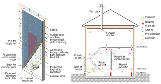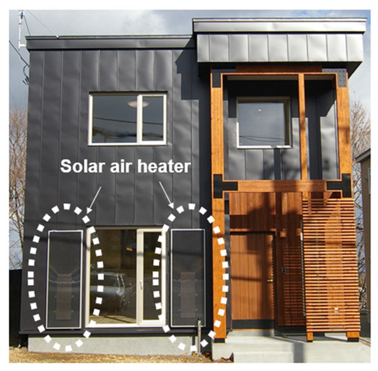 With regard to verifying the combination of passive ventilation and a solar air heater in real buildings, Khedari et al. [18] proposed the dwelling with SAH on the roof and verified the natural ventilation rate was 0.08–0.15 m3/(s·m2). Yu et al. [19] proposed and verified a hybrid system of active and passive systems. They proved that the indoor environment in both the south and north rooms could maintain a room temperature of 17 °C in winter in a solar demonstration building. Li et al. [20] proposed an energy-saving system that can maintain CO2 concentration below 1000 ppm in an elementary school during winter. However, a simple and less burdensome system needs to be proposed for houses where the maintenance and management needs to be done by the owners themselves.