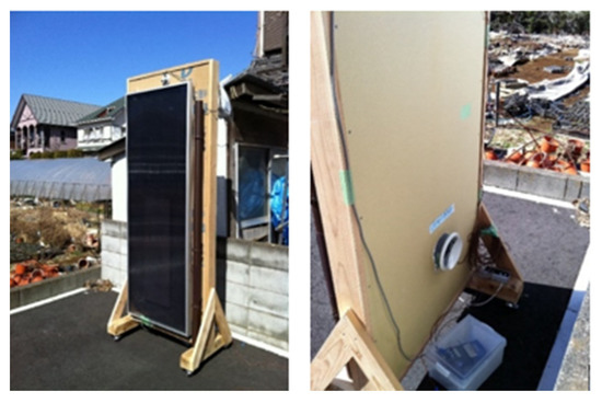 Table 1 shows the performance of the solar air heater. The solar air heater consists of two layers of transparent polycarbonate with insulating properties on the solar radiation acquisition side. Outside air is drawn in through small holes punched in the back of the panel. The air then passes through a felt-like heat-absorbing layer into the panel. The air heated by the solar heat inside the panel is supplied to the room by a built-in fan. The fan is driven by electricity from the panel’s built-in power generation panel. The actual heat collection area per panel is 1.326 m2 (1950 mm × 680 mm). The maximum capacity of the solar air heater is about 100 m3/h, and they can heat outside air by about 30 °C, with a maximum capacity of about 1000 W. The fan airflow rate varies from 60 to 110 m3/h depending on the amount of solar radiation and controller adjustment.