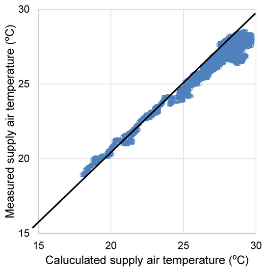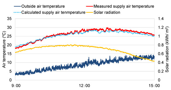 Table 2 shows the summary of the experiments to identify . The solar air heater was set up as shown in Figure 2, and the amount of vertical solar radiation on the panel, the temperature at each point, and the blow-off temperature were measured. The solar radiation measurements were instantaneous and were greatly affected by temporary clouds and shadows. To minimize measurement errors, the measurement interval was set to one second, and the results were averaged over one minute for evaluation. The was identified from the experimental results and Equations (2) and (3).