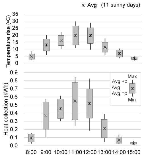 - Actual measurements were conducted in a real building: the maximum temperature increase effect of the solar air heater was about 30 °C, the maximum heat collection per hour for one solar air heater was 0.85 kWh, and the average heat collection at 11:00, when the most heat collection was obtained, was 0.55 kWh. The standard deviation was as large as 6.8 °C for temperature rise and 0.23 kWh for heat collection, showing the difference in the effect of sunlight. In January, when the solar altitude was low, solar radiation acquisition was not obtained before 9:00 a.m. and after 2:00 p.m. due to the influence of neighboring houses.