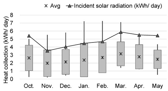 Next, we evaluated the solar air heater for the period from October 2015 to May 2016, including nonsunny days. Figure 8 shows the monthly average daily heat collection and daily average incident solar radiation of the solar air heater as a box-and-whisker diagram. The maximum standard deviation was 2 kWh in January, indicating that it was greatly affected by the weather. Even with this influence of the weather, the lowest daily average heat collection was 2.3 kWh/day on average in December, and the highest was 3.2 kWh/day in March. The average heat collection during the heating period was 2.1 kWh/day.