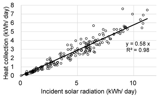 In order to clarify the efficiency of the solar air heater, Figure 9 shows the relationship between the amount of incident solar radiation and the amount of heat collected by the solar air heater averaged over one day.